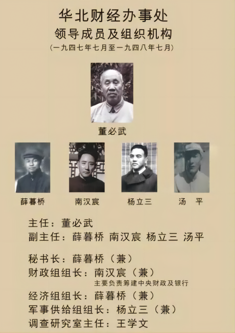 1947年3—4月,在晋冀鲁豫解放区的邯郸召开华北各解放区财政经济会议,提出财政、经济、金融、贸易进一步统一的建议。10月24日,中共中央批准华北财经会议报告,决定成立以董必武为主任的华北财政经济办事处,统一领导华北各解放区的财经工作。石家庄解放后,华北、陕甘宁、山东解放区日趋稳定,为适应金融贸易日益密切的联系,1948年4月17日,冀南银行总行与晋察冀边区银行总行共同发出通告,宣布两行在石家庄联合办公;7月22日,冀南银行与晋察冀边区银行奉命合并,改称华北银行,总经理为南汉宸。