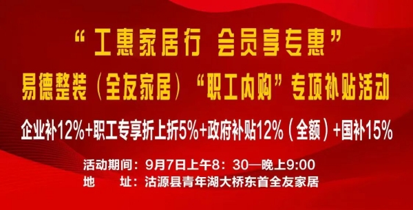 为深入践行服务职工的宗旨,切实把工会组织的关怀与政府的惠民暖意送到职工身边,县总工会、县工商联、沽源县易德装饰装修有限公司(全友家居)联合开展家居建材普惠服务活动。活动不仅为广大工会会员带来专属福利,更叠加了实实在在的政府补贴和国家补贴,让工会会员在购置家具、焕新家居时享受到真正的实惠。现将有关事项通知如下: