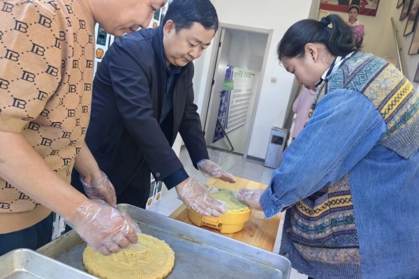 驿站内早已暖意融融,长条桌上整齐摆放着橙黄的桃山皮面团、油润的豆沙莲蓉馅料,以及印着“中秋快乐”的雕花模具 。在专业烘焙师的示范讲解下,区总工会领导携工作人员很快上手,在欢声笑语中,一个个包裹着枣泥、豆沙等馅料的面团,经过模具压制,变成了印有“中秋快乐”字样的精致月饼,原本陌生的劳动者们在协作中拉近了距离,驿站俨然成了一个热闹的“大家庭”。
