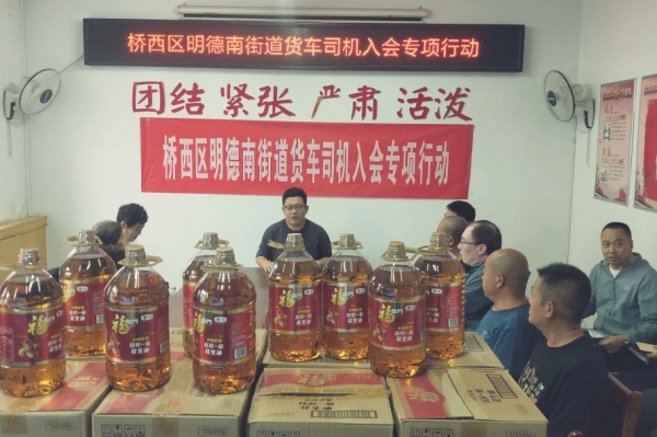 明德南街街道总工会8月8日在“货车司机行业工会联合会集中入会”活动中,由街道党工委副书记、总工会主席带队,详细介绍工会法律援助、困难帮扶、医疗互助、普惠服务(加油充电优惠)等项目,并现场答疑解惑,发放花生油等“暖心慰问礼品”,传递组织关怀。